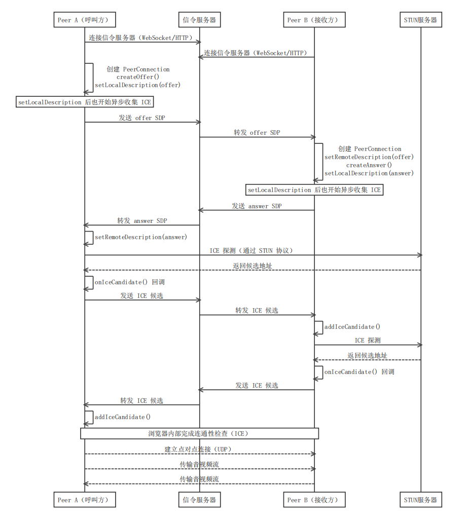 双方创建音视频设备和连接实例,通过信令交换连接信息,协商通信参数后收集并交换网络地址,完成连通性测试后建立 P2P 连接,开始实时传输数据。